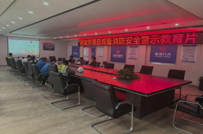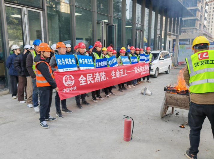 各二级单位迅速响应,掀起消防宣传热潮。大坤公司组织项目管理人员、班组负责人及工人代表观看警示片,结合国内火灾案例开展宣贯,强调施工现场动火作业、材料堆放等风险点,要求全员自查自纠。城投·武汉印项目部在大门口大屏循环播放消防教育片,悬挂宣传横幅,组织多场安全培训,讲解灭火器使用、应急疏散等技能,普及“三清三关”常识,让安全知识入脑入心。城投·金沙府项目部开展“消防安全进班组”活动,通过模拟火灾场景演示灭火器使用、消防栓操作及心肺复苏技巧,确保每位工人掌握“提、拔、握、压”四步灭火法及具备疏散标识识别能力。 实战演练是提升应急能力的关键。11月20日—21日,组织城投·红树林、城投·金沙府、城投·武汉印项目开展消防应急演练,模拟火灾场景,检验队伍协同处置能力。此次演练投入应急车辆、灭火器等物资,40余人参与,有效提升了应急处置能力。